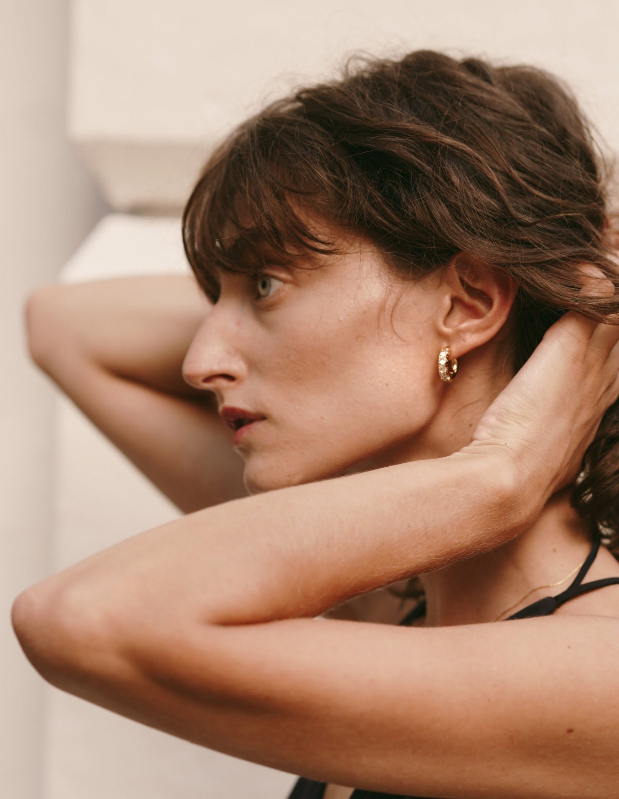 These stunning hinged hoop earrings showcase round white stones, secured in a classic prong setting. The hoops dazzle endlessly. A timeless and luxurious style.